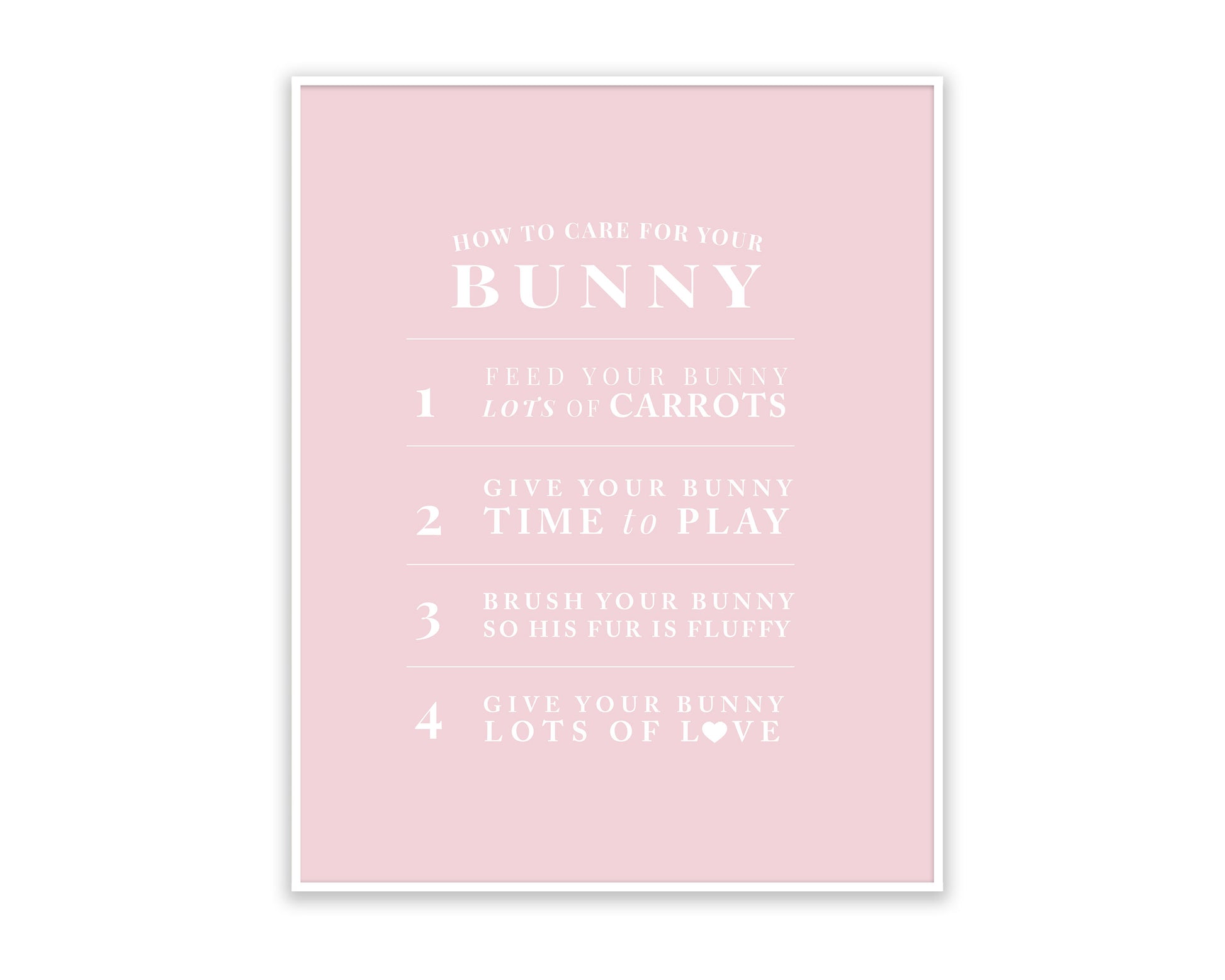 Bunnies requires lots of love and attention! This sweet print outlines the important steps required to take care of the fluffy bunnies in your life.